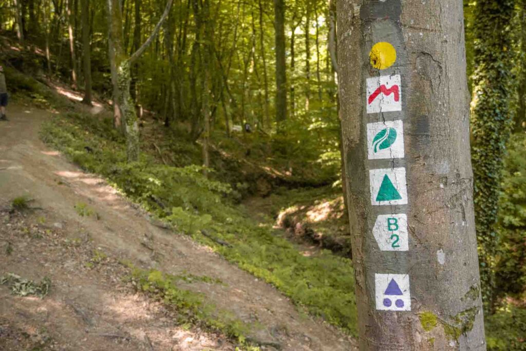 This short yet unique trail begins at the Berdorf Tourist Information Point, located next to Camping Martbush just outside the center of Berdorf. From here, you can directly enter the woods. There are several large parking areas where you can easily park your car for free. If you’re traveling with a motorhome, you can’t stay overnight in this parking area, but you can do so at Camping Martbush.