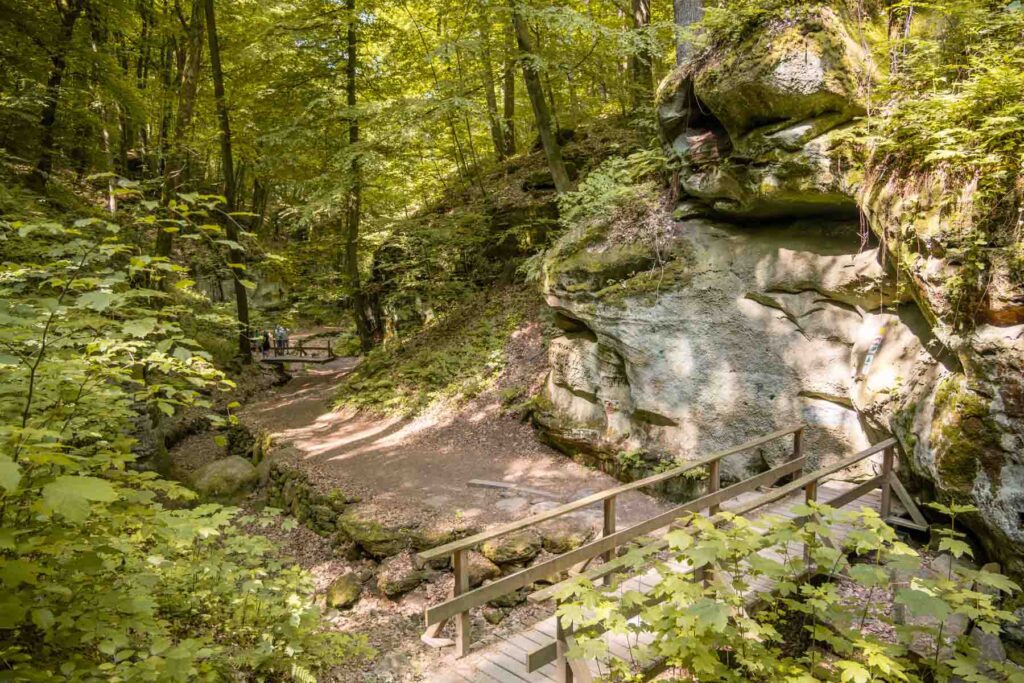 Just before Camping Martbush, you’ll find a narrow path leading into the woods. Turn here to start the B2 trail. You’ll follow a dirt path that guides you deeper into Müllerthal, with the B2 markers on the trees as your guide. Soon, rocks begin to appear, and you enter a narrow gorge. The wooden bridges you encounter turn into a metal suspension bridge that leads you through the gorge. This is quite spectacular for a first taste of Müllerthal!