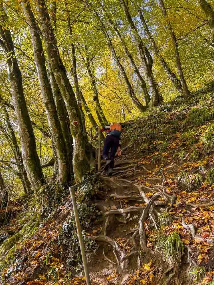 From this point the walk really starts and you notice that immediately. It goes down steeply along narrow forest paths covered with leaves and is sometimes quite slippery. You have to watch out for sliding boulders and unfortunate protruding tree roots. You’ll find not falling is quite a challenge!