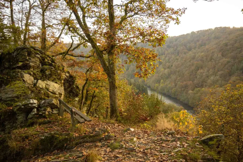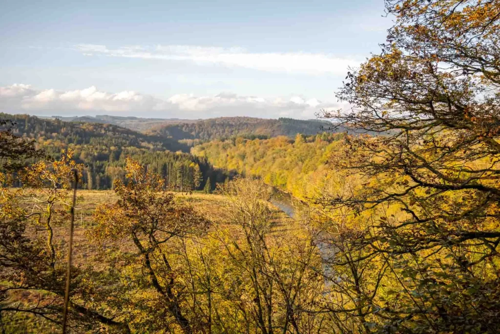 After this view, the route continues downhill again. On the flanks of Le Tombeau du Chevalier, you descend towards the river, until you reach the banks completely. Not a boring path but a road along heather and ferns. Now you are about halfway through the hike. The second part of the route takes you further along the banks until you arrive back in Herbeumont.