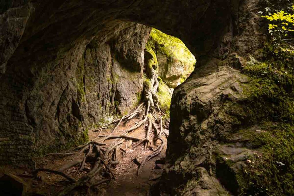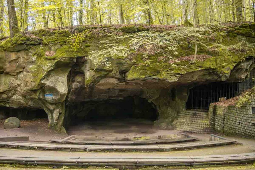 I started at the Huel Lee parking, where there’s a sign with all the details about the E1 trail. You enter the forest and immediately come across one of the absolute highlights of this hike: Huel Lee. Huel what??? These are a series of rock formations and caves where locals used to carve millstones to grind their grain. If you look up, you can still see the round indentations from the millstones. One of these caves now serves as a theatre, while the others are fun to explore.