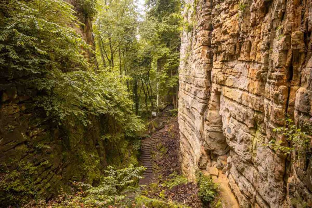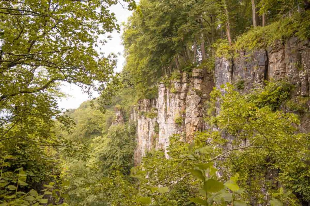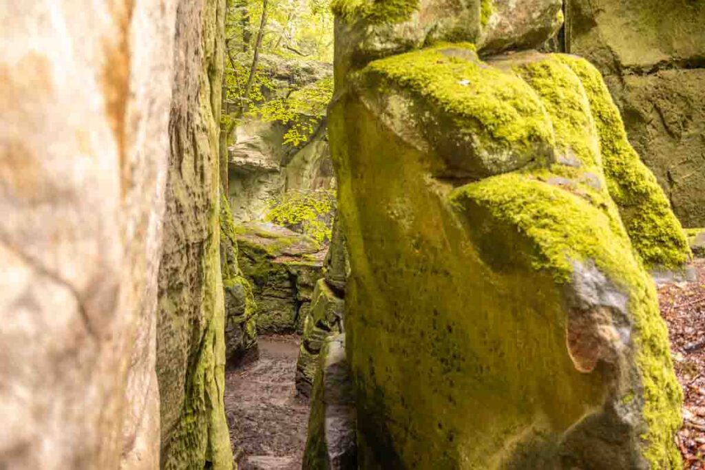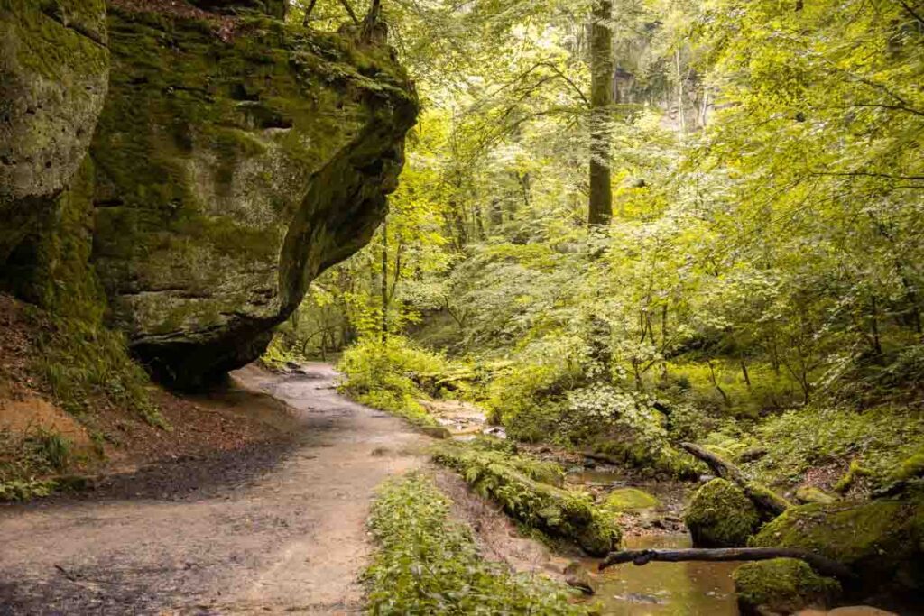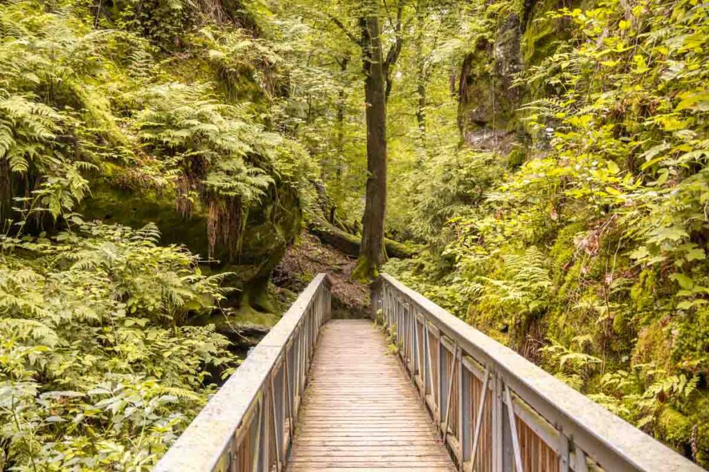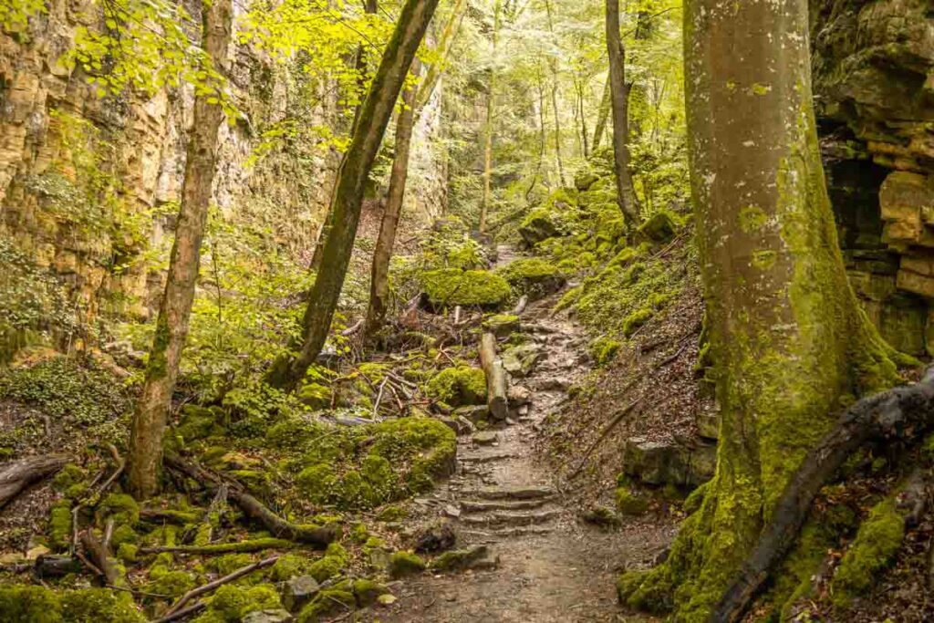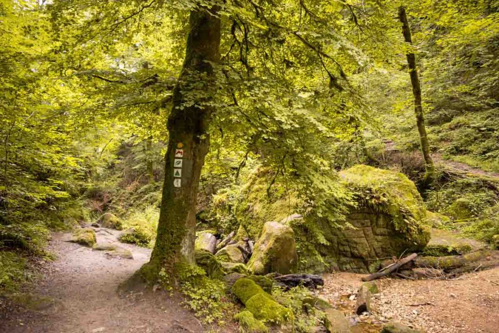 You’ll gradually notice that you’re gaining elevation. We’ll eventually need to descend to reach Echternach, starting when you encounter the Gorges du Loup on your route. This natural gorge was formed long ago by landslides, and the E1 trail takes you right through it. It’s incredibly spectacular to see, with the rock blocks from the landslide still scattered everywhere. Be sure to watch your step!
