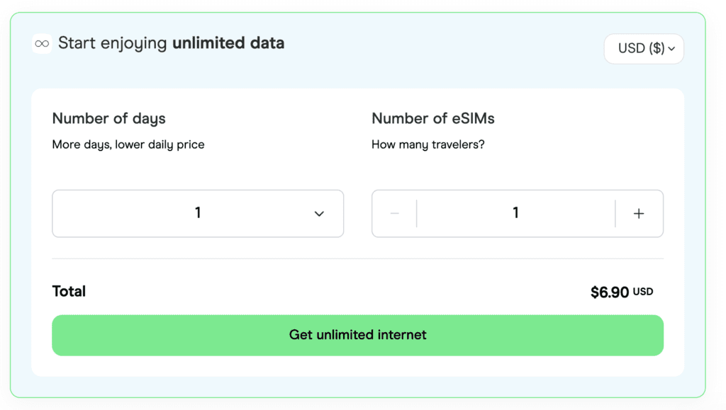 The website of Holafly is very straightforward which makes ordering a SIM card or eSIM a piece of cake. You just choose a plan according to the number of days you’re traveling which has unlimited data attached to it for the period you need it! What’s more, they are actually the first data providers with unlimited data for eSIMs!