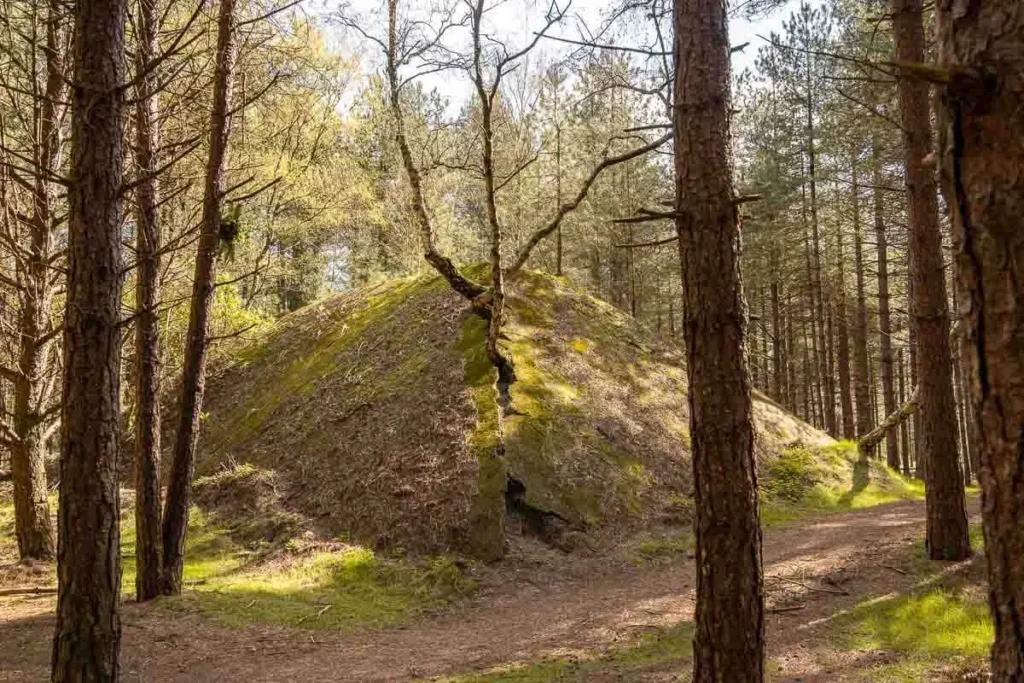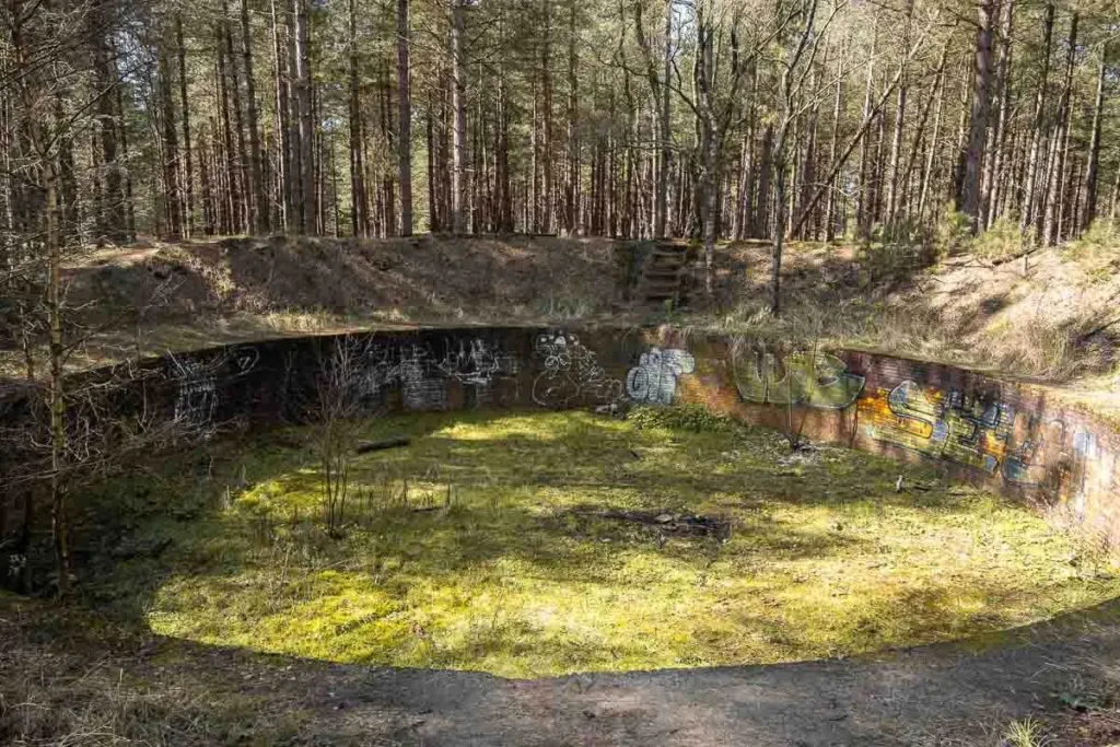 A little later you arrive at a paved cycle route that takes you along for a while before you dive back into the heath and forests. This part you walk through coniferous forest that served as a shooting range until not so long ago. Ammunition was tested or detonated here. A number of strange abandoned constructions are still reminders of this. You will find a number of bunkers where they tested the impact of projectiles, a destruction pit where explosives were detonated and a strange-looking pyramid where anti-personnel mines were tested. These constructions are gradually being taken over by nature and therefore make many a heart beat faster. So was mine!