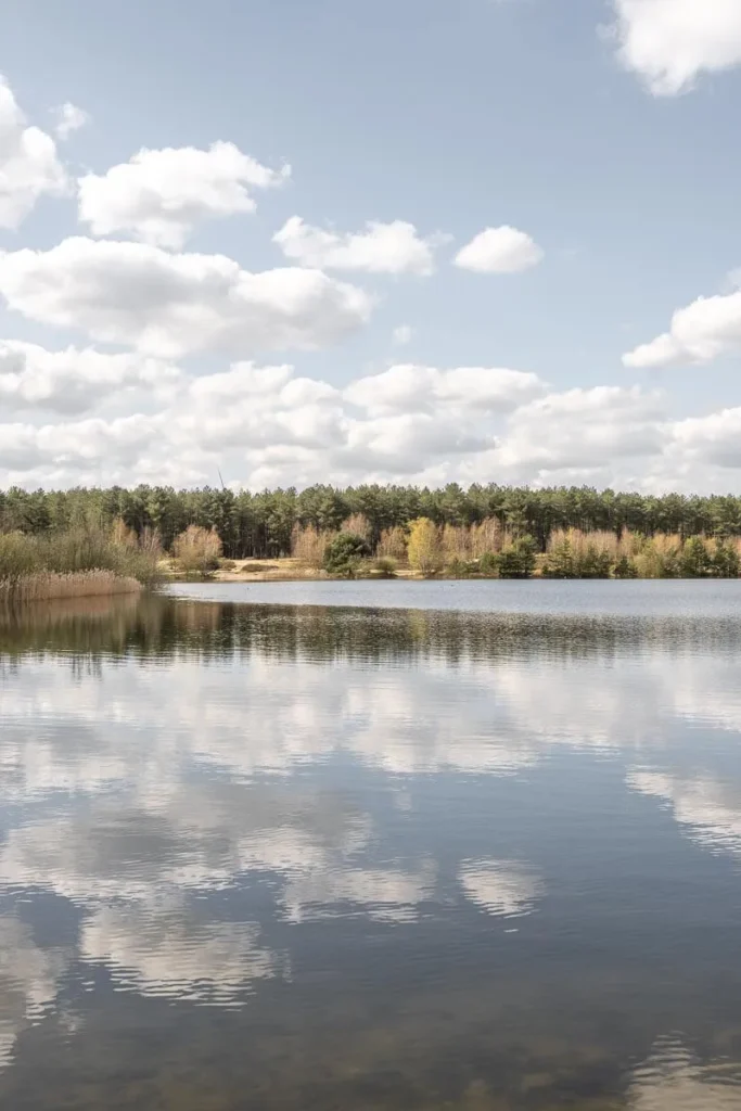 When you arrive at the water’s edge, you can enjoy the perfect reflection of the clouds on the water’s surface when the weather is nice. You have to be careful because the lake is struggling with a type of blue-green algae that can be poisonous. So it is best not to touch the water and not to let your dog romp in the lake. A walk on the ‘beach’ or just enjoying the sun is possible!