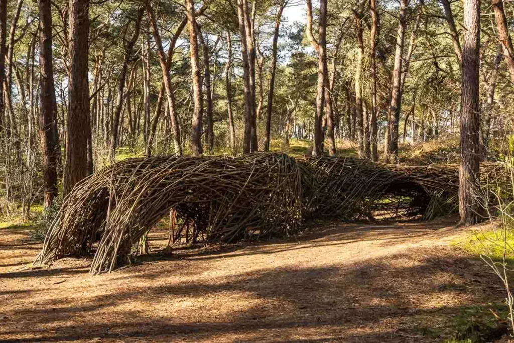 Once we arrive at the forest consisting of conifers, the hike really starts. This is also a paradise for children, because they will find a lot of nice installations made from willow branches, a piece of art by Will Beckers, and a small playground. If you do the red trail, you will soon leave this piece of forest behind you to walk towards the Sahara itself. The forest gradually flows over into sandy soil and soon you trudge through the sand towards the lake of the Lommel Sahara.