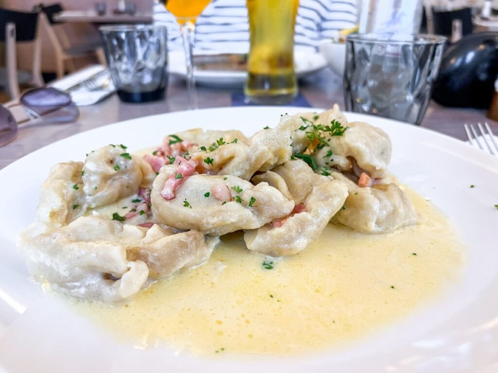 In my opinion, you can compare Luxembourgish cuisine a lot with German cuisine, including some elements of the Belgian & French kitchen. As my guide told me “it has the quantity of the German kitchen and quality of the French kitchen”. The Kniddelen mat Speck, although very simple, are recommended. So are the Wainzoossis mat Môschterzooss.