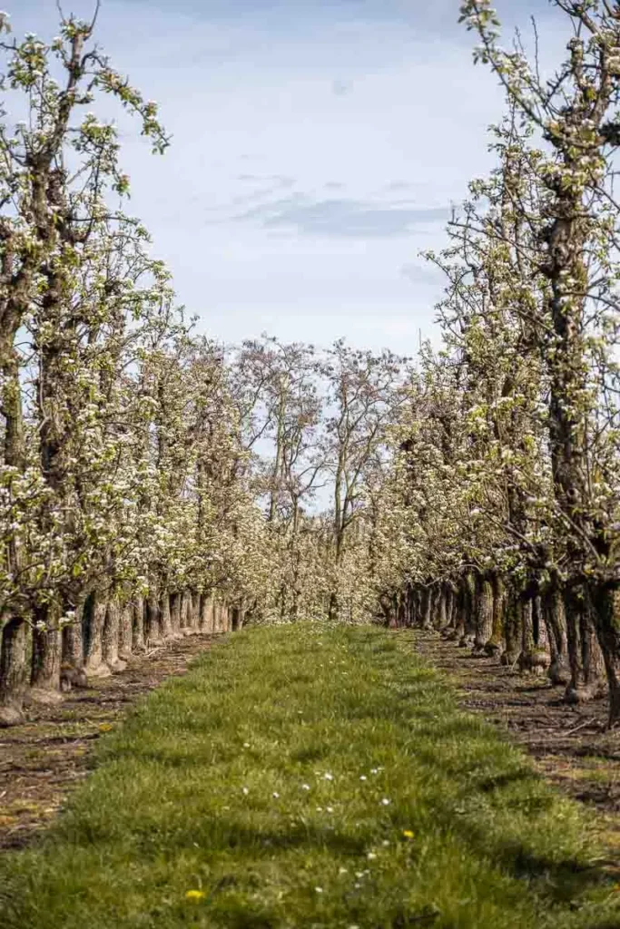 The hike goes up a ledge between the foliage until the branches give way to a beautiful view of the surrounding fields. Here there is a bench to enjoy the view, although that may be a bit fast for about a few hundred metres from the starting point. At the very top, you eventually end up in the first fruit orchard. Here they grow pears and they were already in bloom at the time of my visit – at the end of March. Wonderful!