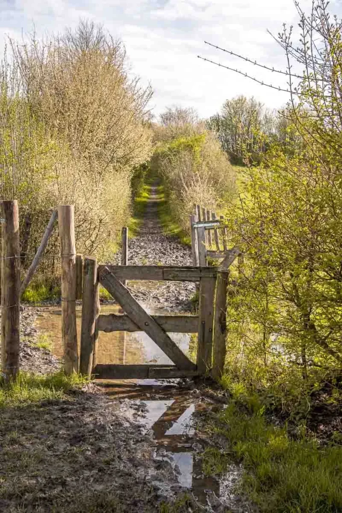The orange walking route starts immediately uphill. But don’t worry, during the walk there are no steep climbs, just the occasional ups and downs of the rolling hills. You first pass a meadow, where you have to go through a gate to ascend. During my hike, this was a big mud puddle and it took me 10 minutes to figure out how on earth I would get past it. I finally succeeded, but I can tell you that mudproof shoes are a must.