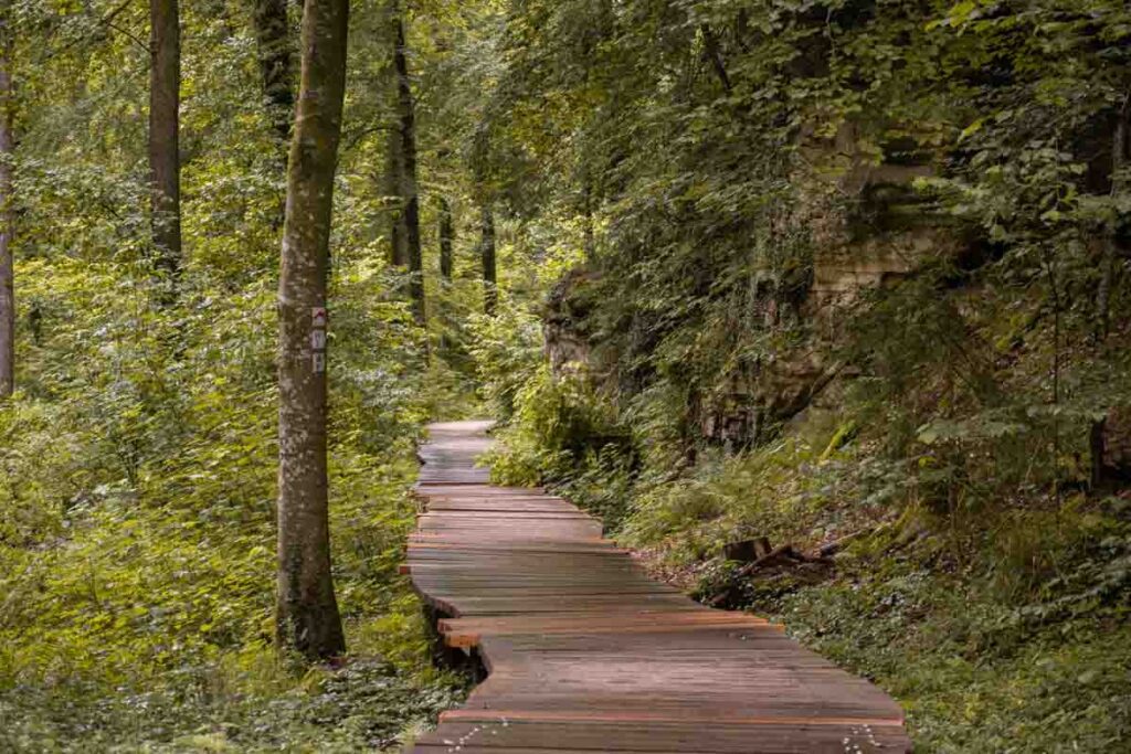 Once you’ve completed the loop, you’ll walk a few hundred meters on wooden boardwalks. Be careful here, as wet wood can be slippery and not all wooden planks are perfectly level. Eventually, you’ll arrive at the Kallektuffquell, where you can sit and enjoy the view.