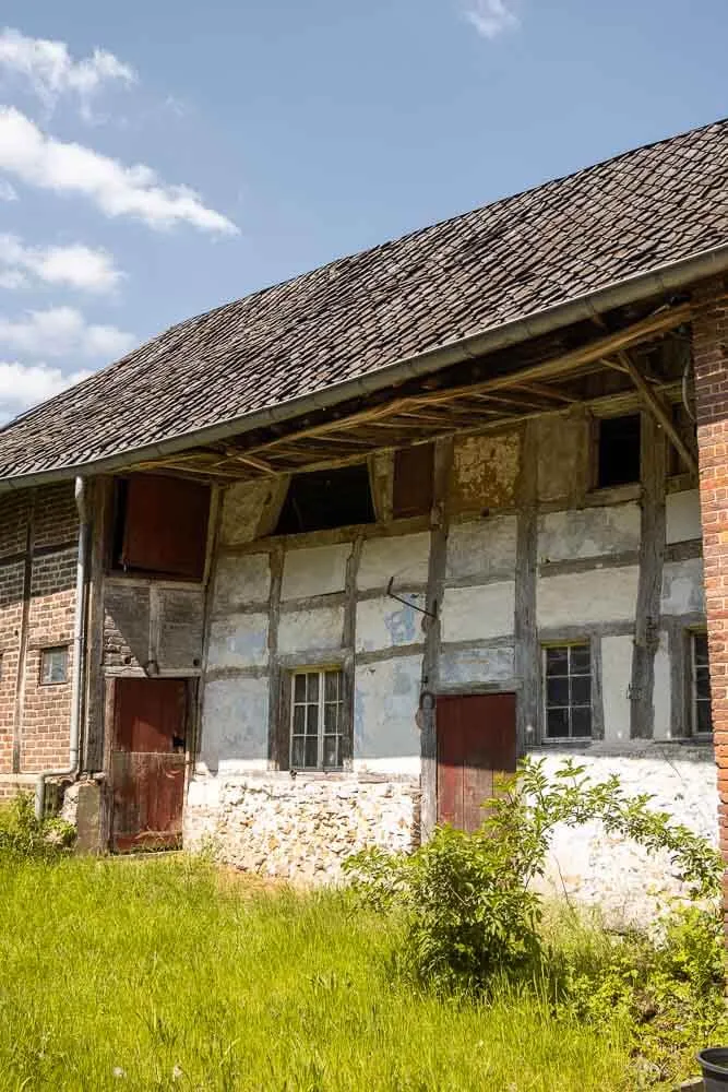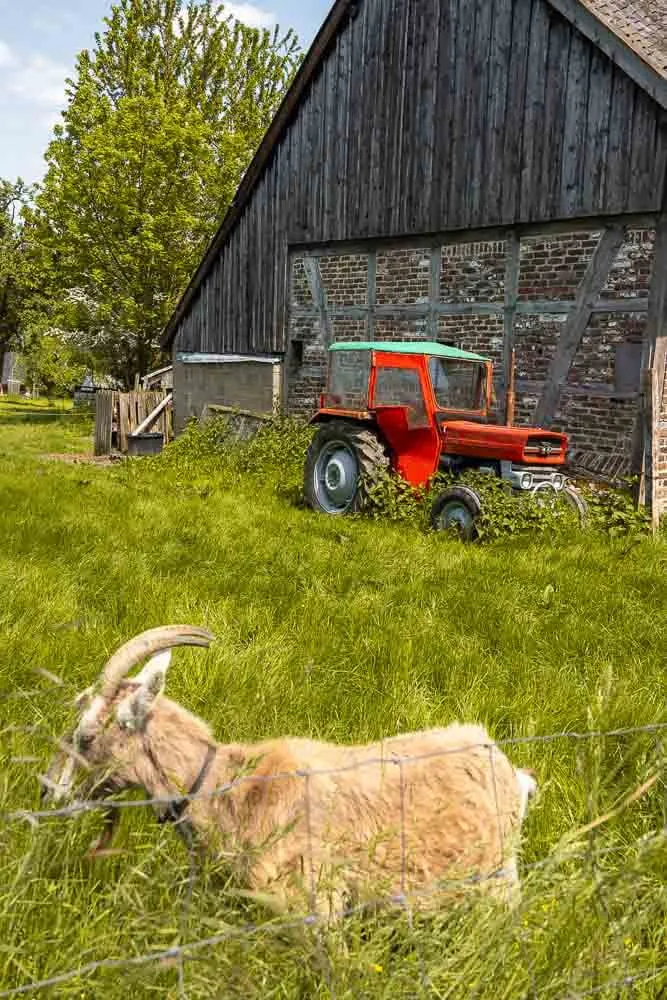 After this you walk on a paved road past a number of typical half-timbered houses. If you are lucky you will also encounter a number of farm animals here that are open to a cuddle. Then you continue your way in the Veurs valley between the fields. Until you arrive at the commandery of Sint-Pieters-Voeren. This historic castle dates back to the Middle Ages but is now a breeding domain for trout. In the water basin around the castle you will find hundreds of fish swimming happily in the spring water of the Voer. Yes indeed, here you will find the source after which the Sources Hike is named!